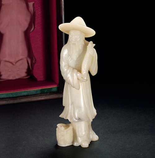 此件雕刻渔翁形象,渔翁戴笠于顶,面庞圆润,表情慈蔼,满面含笑,长髯飘于胸前。老翁身着长袖布衣,头带草帽,作站立状,双手持一尾鲤鱼,脚旁置一尊鱼篓,俨然一幅渔翁收获图(渔翁得利)。雕件整体比例协调、完整,生活气息浓郁。