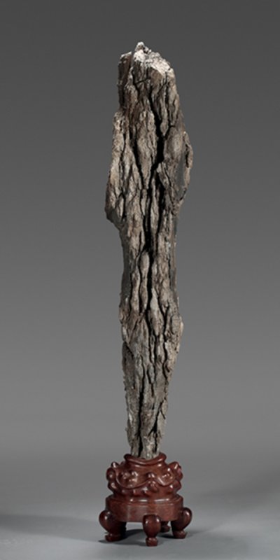 此英石秀挺娴逸,恣仪秀朗,犹如一柱直上云霄,其石质色黑带灰、灰中带褐,如生铁带锈,又如陨石天成,十分独特罕见。石形自然秀雅,包浆厚润,质地细密,声音清越,属文房陈设佳品。