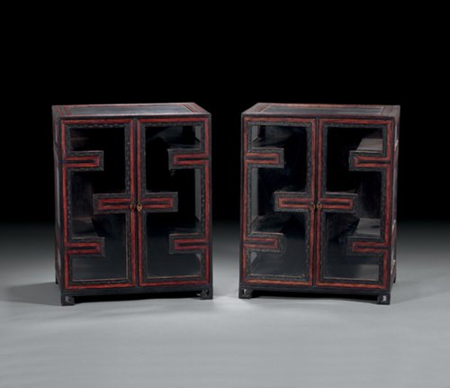 多宝格的柜具,是清代创新的一种家具,从结构形式上,不难看出它是由明代的万历柜演变而来,亦可简称为“柜格”。从清宫绘画中获知这种形式的柜格自雍正年间就出现了,因其兼备功能和观赏性,且装饰性强,符合当时的审美取向,故在有清一朝受到喜爱,逐渐流行。小型的炕用柜格一般是放置在炕的一侧,靠墙摆放,也有陈列在条宽,几架之上,作为摆设。清代的生活习惯是以炕为活动中心,在炕头一侧的柜格上,主人可随其喜好放置与各个空间相适合的艺术品、工艺品以及用文具,不仅能在室内造成悦目的装饰效果,坐在炕上可随手拿出把玩,其乐无穷。传世的精美紫檀炕用柜格十分少见,此对小柜榫卯结构严谨,做工手法娴熟,当出良匠之手,某些细部特能显示出其精致和考究。