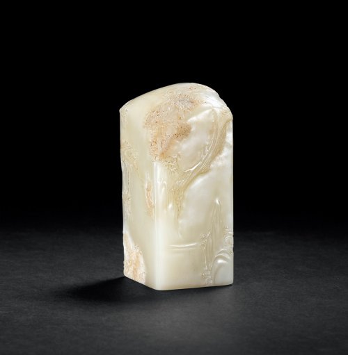 印章由白芙蓉雕刻,印四壁和顶部连在一起巧雕松树、仙鹤和梅花鹿,寓意鹤鹿同春、松鹤延年,寓意吉祥。印采用浅浮雕工艺,纹饰刻画极其细腻,线条流畅,局部细节处理十分用心。印章质地致密,印面为素面,可刻文使用。
